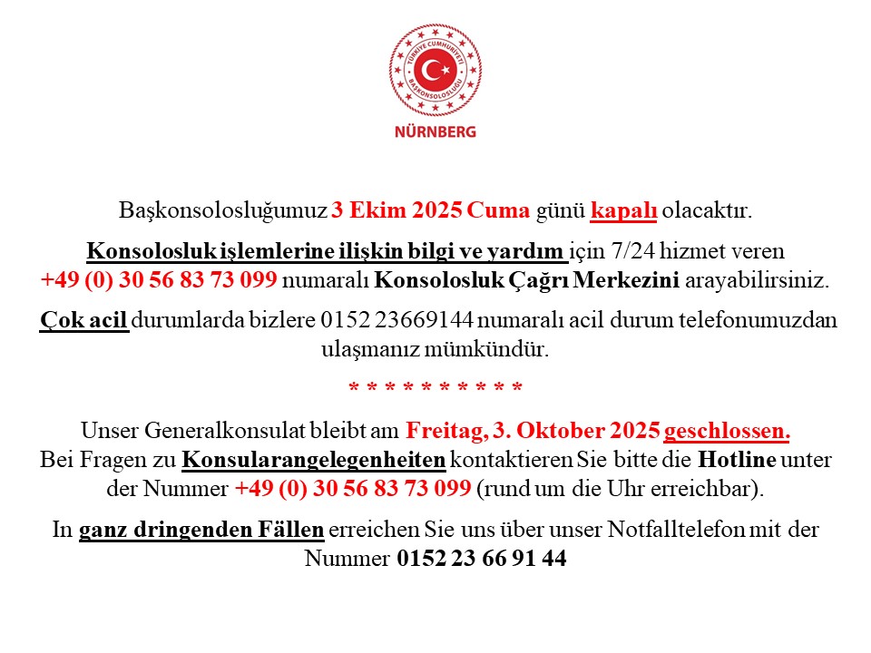 Başkonsolosluğumuz 3 Ekim 2025 Cuma günü kapalı olacaktır.